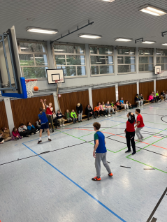 Am 06.12.2023 fand das Basketballturnier der Klassen 7, 8 und 9 in der Turnhalle der Helene-Pagés-Schule statt. In diesem Jahr wurden zum ersten Mal, auf Wunsch der SpielerInnen, die Mannschaften gemischt, so dass die SchülerInnen in etwa vier gleichstarken Mannschaften gegeneinander gespielt haben. Gespielt wurden sechs Spiele à 7 Minuten, immer lautstark unterstützt und angefeuert von den anwesenden ZuschauerInnen. Das gesamte Turnier lief sehr fair und ohne Fouls ab, alle hatten viel Spaß und lieferten einige sehr engagierte Szenen und Einsätze.