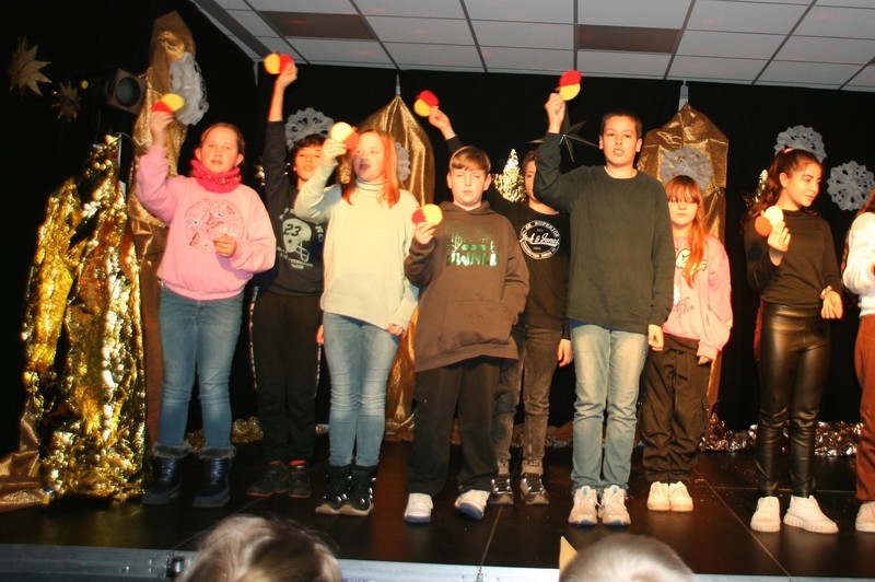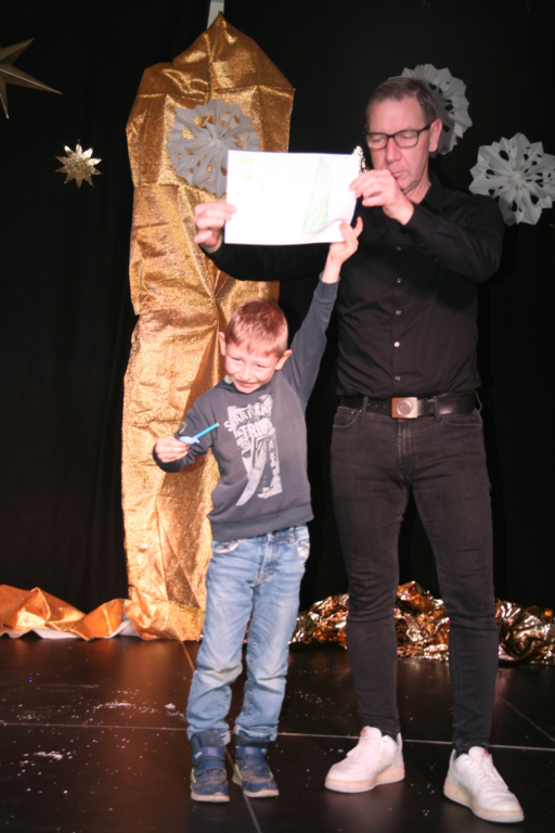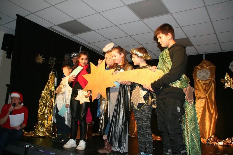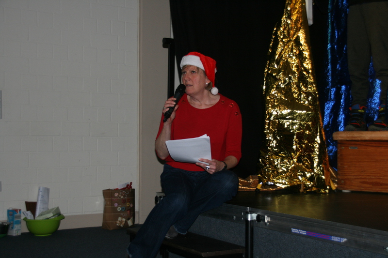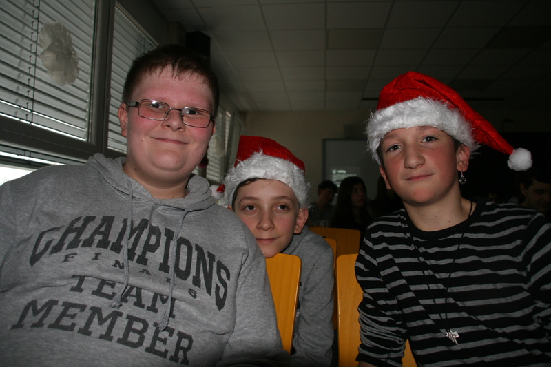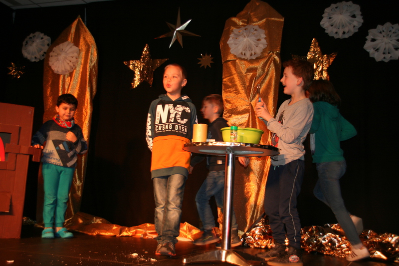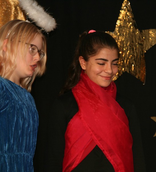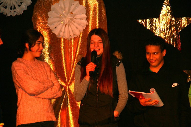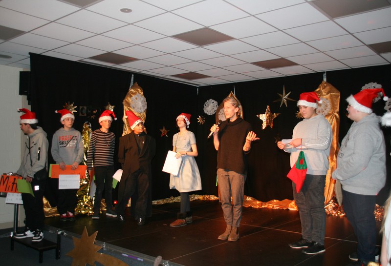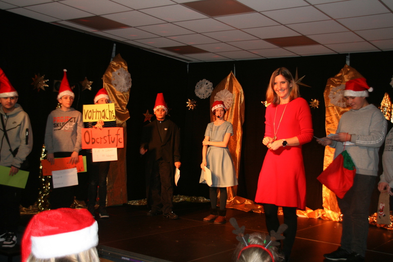 gemeinsamen Lied „Ihr Kinderlein kommet“ übernahm die Klasse 6/7. Sie leitete durch eine inszenierte Weihnachtsshow, bei der die Lehrer der Schule Weihnachtsbegriffe erklären, malen oder pantomimisch
