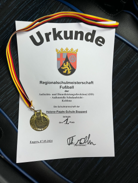 Der verdiente Lohn war der erneute Gewinn der Regionalmeisterschaft. Als bestes Team der kleinen Förderschulen (bis 10 Klassen) wartet nun das nächste Turnier auf die Mannschaft. Am 20. Juni trifft man in Andernach im Landesfinale auf die Sieger der Schulbezirke Trier und Neustadt. Das Ziel ist es, den im vergangenen Schuljahr errungenen Titel des Landesschulmeisters zu verteidigen. Erneut die beste Schulfußballmannschaft der kleinen Förderschulen in Rheinland-Pfalz zu sein, wäre eine tolle Sache für die gesamte Schulgemeinschaft der Helene-Pagés-Schule aus Boppard.
