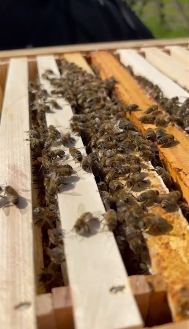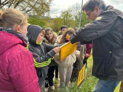 Unter der Leitung von Rudi Stumm konnten die Schüler*innen die gebauten Waben, den gesammelten Nektar und den entstandenen Honig bewundern, während die Bienen friedlich weiterarbeiteten. Um den Exkurs abzurunden, durften die Kinder das Etikett für den gewonnenen Bienenhonig entwerfen, da ein Teil des eingenommenen Geldes dem Förderverein der HPS zugutekommen wird!
