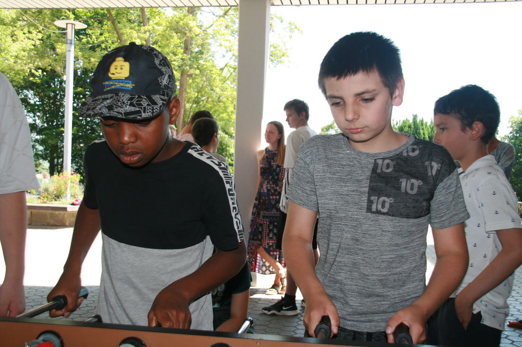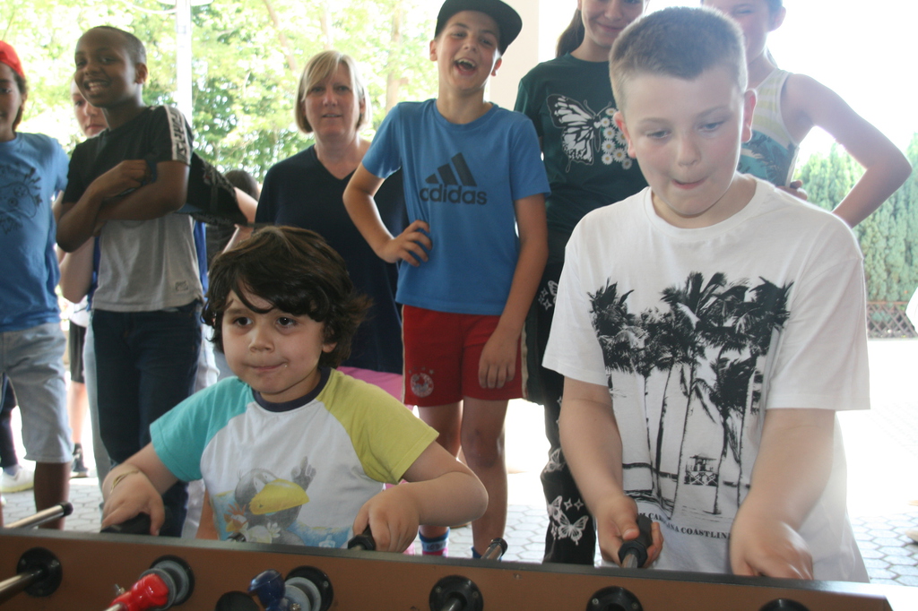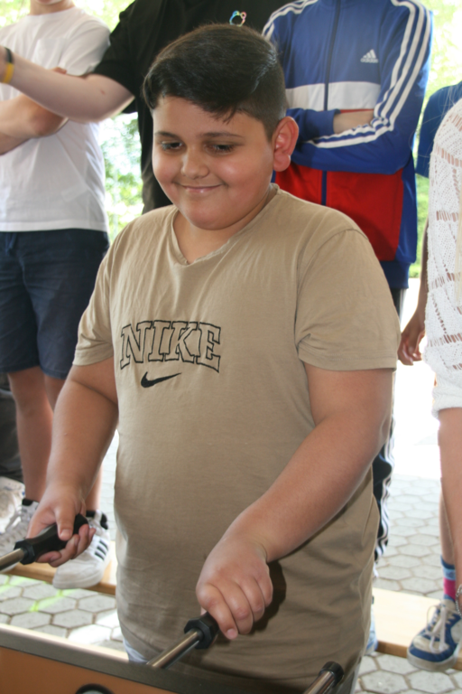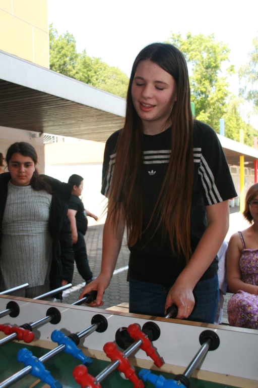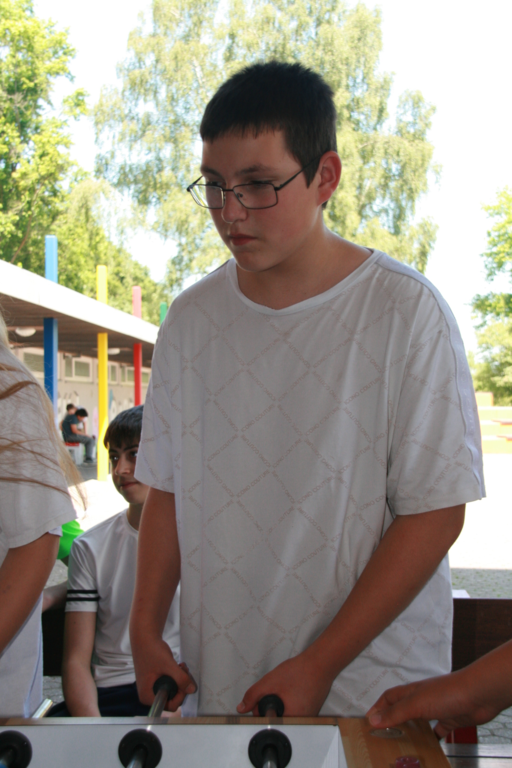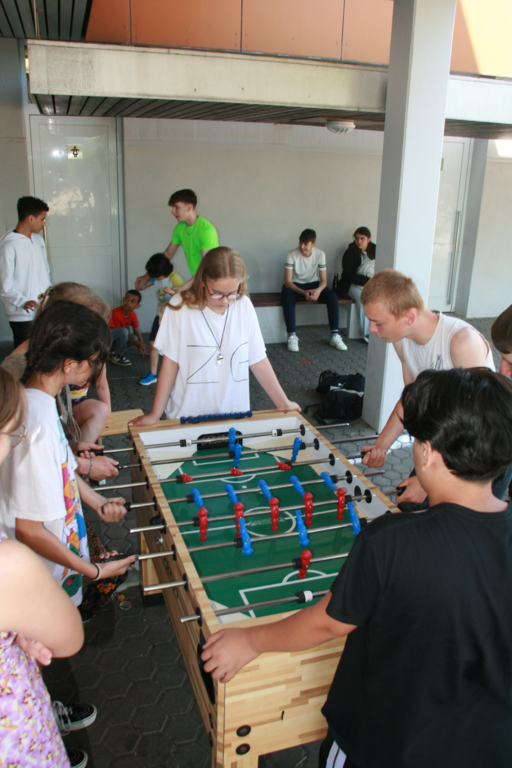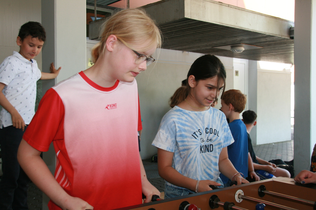 Im Rahmen der Fußball Europameisterschaft in Deutschland fand am 26.06.2024 bei bestem Wetter das Tisch-Kickerturnier der Helene-Pagés-Schule statt. Mit der Unterstützung der SV, die dies mitorganinsierte, trafen geloste Paare der Unterstufe, wie auch geloste Paare der Mittel- und Oberstufe, untereinander an. Zur Freude einiger SchülerInnen beteiligten sich auch einige Lehrerinnen am Turnier. Bei ausgelassener Stimmung konnten Fin und Niklas das Turnier "der Großen" für sich gewinnen, während bei "den Kleineren" Raza und Jaden alles abräumten.