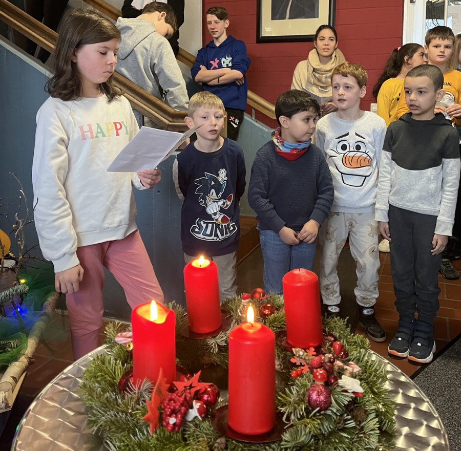 Um die Schulgemeinschaft nach der Pandemie wieder zu beleben und das Gemeinschaftsgefühl der Schüler*innen untereinander zu stärken, fand in der Vorweihnachtszeit wöchentlich ein adventliches Treppenhaussingen in der Helene-Pagés-Schule statt.Nach jedem Adventssonntag trafen sich Montag morgens alle Klassen im Treppenhaus der Schule, um gemeinschaftlich zu singen und eine Kerze des Adventkranzes anzuzünden.