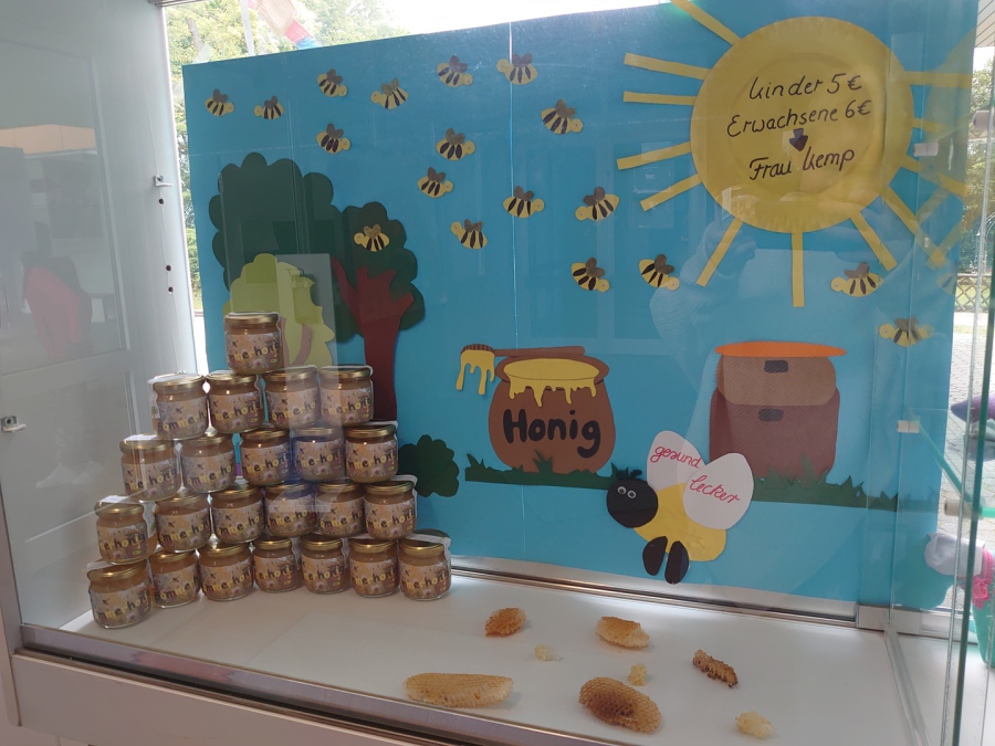 Es ist soweit! Die Bienen haben um die Helene-Pagés-Schule herum fleißig gearbeitet und schmackhaften Honig für die Schulgemeinschaft hergestellt. Die Mittelstufe designte hierzu Etiketten und Siegel, indem sie ihre Ideen zusammentrug und